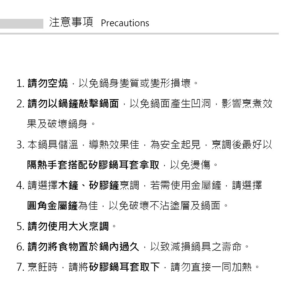 ■本鍋具儲溫,導熱效果佳,為安全起見,烹調後最好以隔熱手套拿取鍋蓋或把手,以免燙傷。